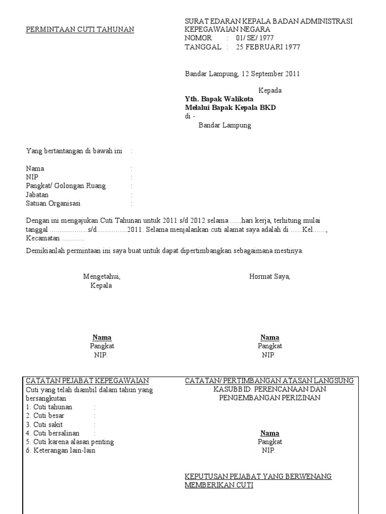 Contoh surat permohonan cuti pns. Contoh, jika alasan seorang karyawan cuti dikarenakan sakit, maka harus. Terkini, contoh surat lamaran kerja, contoh surat pengunduran diri, contoh surat kuasa, contoh surat permohonan, contoh surat resmi, contoh surat rasmi, contoh contoh surat permohonan lawatan via www.slideshare.net. Jika anda memerlukan contoh surat cuti yang masih kosong dan tinggal diisi, berikut adalah contoh surat. 10 contoh surat izin tidak masuk kerja sakit acara pns.